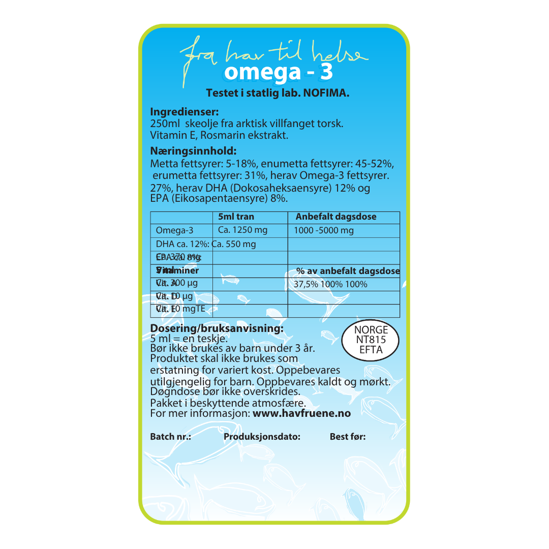 Ingredienser: Arktisk fiskeolje fra torsk, naturlig vitamin E, vitamin A, vitamin D3 og eterisk rosmarinolje.